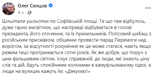 "Шлепали ушлепки по Софийской площади. То что там произошло, очень хорошо показывает, что происходит в голове президента, его окружения и их сторонников. Попсовый шабаш с российским привкусом, обещания провести парад Победы над врагом, при отсутствии понимания, как это может произойти, даже если режим тишины продержится сотни лет.
