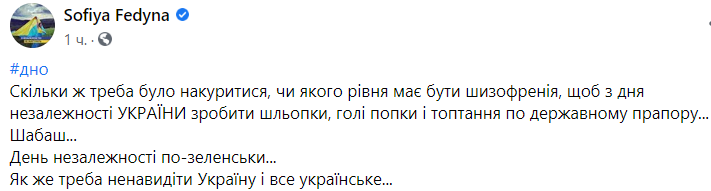 "Как же надо было накуриться, или какого уровня должна быть шизофрения, чтобы из дня независимости УКРАИНЫ сделать шлепки, голые попки и топтание по государственному флагу. Шабаш. День независимости по-зеленски. Как же надо ненавидеть Украину и все украинское", - написала в Фейсбуке нардеп от "Европейской солидарности" София Федына.