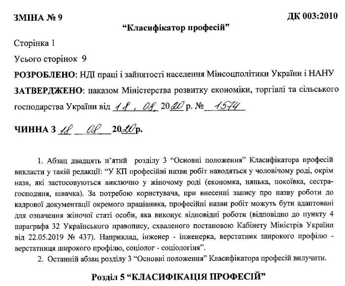 В Украине официально разрешили использовать феминитивы (названия профессий, обозначающие, что специалист - женщина) в кадровой документации.