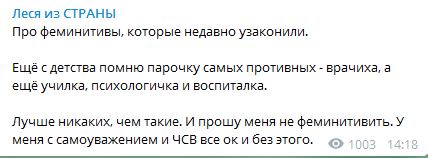 "Про феминитивы, которые недавно узаконили. Еще с детства помню парочку самых противных - врачиха, а еще училка, психологичка и воспиталка. Лучше никаких, чем такие. И прошу меня не феминитивить. У меня с самоуважением и ЧСВ все ок и без этого" - написала она.
