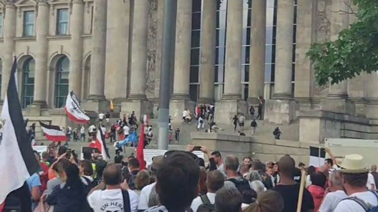 В Берлине, где сегодня прошла многотысячная акция против продления карантинных ограничений из-за коронавируса, часть радикальных демонстрантов прорвала оцепление и пошла на штурм Рейхстага. В их руках были флаги кайзеровской империи.