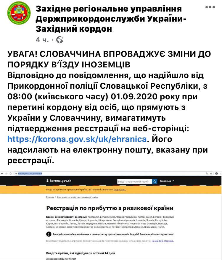 Так, с 08:00 вторника, 1 сентября, по киевскому времени при пересечении границы от лиц, следующих из Украины в Словакию, будут требовать подтверждения регистрации на этой веб-странице. После чего, по данным пограничников, оно будет направляться на электронную почту, указанную при регистрации.