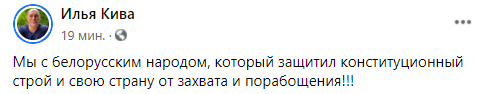 "Мы с белорусским народом, который защитил конституционный строй и свою страну от захвата и порабощения!" - написал на своей странице в соцсети нардеп Илья Кива и опубликовал фото, на котором на фоне белорусского флага он позирует вместе с коллегой по фракции Виктором Медведчуком.
