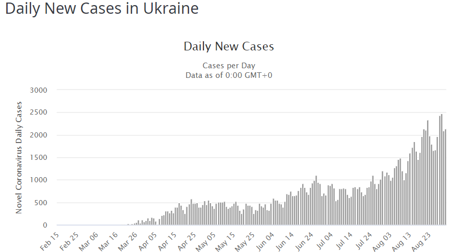 1 сентября Денис Шмыгаль озвучил предположение, что уже к началу октября суточный прирост новых пациентов с коронавирусом в Украине может вырасти до трех тысяч случаев в сутки. Премьер-министр отметил, что это загрузит больницы более чем на 80% (сейчас они в среднем по стране загружены на 24%).