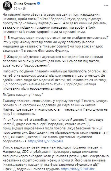Так, Супрун опубликовала пост, в котором раскритиковала практику некоторых рожениц сохранять свою плаценту после рождения ребенка, чтобы потом ее съедать. Это якобы положительно влияет на здоровье, по мнению некоторых мам и блогеров.