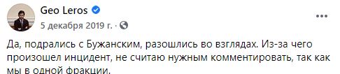 "Да, подрались с Бужанским, разошлись во взглядах. Из-за чего произошел инцидент, не считаю нужным комментировать, так как мы в одной фракции." - написал он.