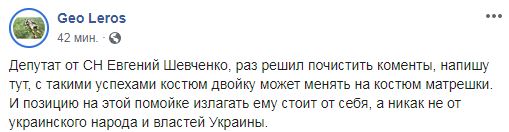 "Депутат от СН Евгений Шевченко, раз решил почистить коменты, напишу тут, с такими успехами костюм двойку может менять на костюм матрешки. И позицию на этой помойке излагать ему стоит от себя, а никак не от украинского народа и властей Украины", – написал Лерос. После него критику Шевченко подхватили и другие депутаты.