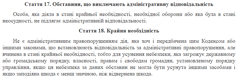 Опытные проезжающие предлагают, даже если постановление неизбежно, ссылаться на статьи 17 и 18 кодекса Украины об административных правонарушениях. Они освобождают от ответственности, если нарушение было сделано в условиях крайней необходимости.