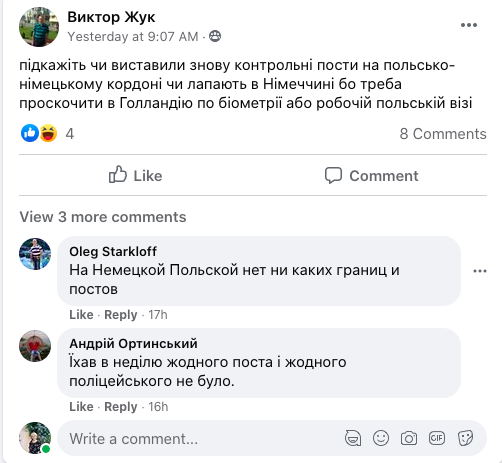 "Подскажите, выставили ли снова контрольные посты на польско-немецкой границе и хватают ли в Германии? Надо проскочить в Голландию по биометрии или рабочей польской визе", - интересуется в одной из тематических групп Виктор Жук.