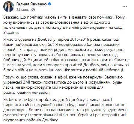 "Считаю, что политики должны уметь признавать свои ошибки. Поэтому, хочу извиниться за свое высказывание в эфире одного из телеканалов о детях, живущих на линии разграничения на востоке Украины.
