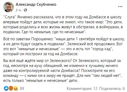 Вы всё ещё ждёте мир от Зеленского? От Зеленского, который за год, несмотря на кучу обещаний, не изменил к лучшему ничего даже на контролируемой части Донбасса? Посмотрите на его команду — с ними он к миру не придёт. Для них "там людей нет", есть только "немытые и нечесаные" дети", - поделился Скубченко.