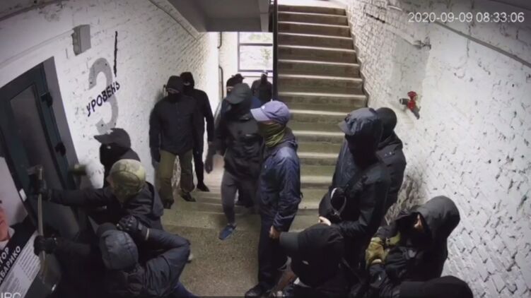 На кадрах видно, как десятки людей в масках собираются возле двери офиса штаба Бабарико, сначала звонят в дверь и пытаются выломать ее руками. Когда попытка оказывается тщетной, они достают лом и молот и при помощи инструментов взламывают дверь и заходят внутрь.