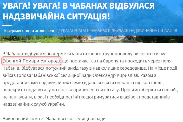 "Только что в Чабанах произошла разгерметизация газового трубопровода высокого давления (Уренгой – Помары – Ужгород), поставляющего газ на Европу и проходящего через поля Чабанов. Происходил мощный выход газа в окружающую среду", – говорилось в сообщении местных властей.