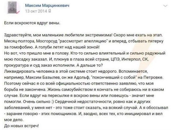 "Ликвидировать человека в этой системе стоит недорого. Вспоминается, например, Максим Базылев, он же Адольф, "покончивший с собой" на Петровке. Поэтому сейчас я со всей официальностью заявляю, что моя борьба не закончена. Жизнь самоубийством я кончать не собираюсь ни в каком случае. Если вдруг на пересылке я вскрою вены или повешусь - значит мне помогли. Очень сильно. Сердечной недостаточности, ровно как и других заболеваний, у меня нет!".