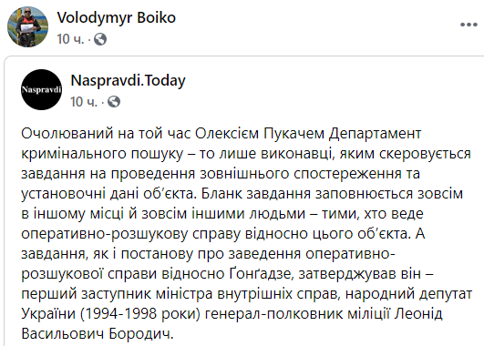 "Возглавляемый в то время Алексеем Пукачем Департамент уголовного розыска – это лишь исполнители, которым направляется задание на проведение внешнего наблюдения и установочные данные объекта. Бланк задачи заполняется совсем в другом месте и совсем другими людьми – теми, кто ведет оперативно-розыскное дело в отношении этого объекта. А задачи, как и постановление о заведении оперативно-розыскного дела относительно Гонгадзе, утверждал он – первый заместитель министра внутренних дел, народный депутат Украины (1994-1998 годы) генерал-полковник милиции Леонид Васильевич Бородич", – пишет Бойко.