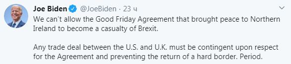 В частности, Байден выступил против законопроекта, внесенного британским правительством в парламент, который может повысить риски возникновения жесткой границы между Северной Ирландией и Ирландией. "Соблюдение (Белфастского) соглашения и избежание жесткой границы — условие для любых договоренностей о торговле между США и Соединенным Королевством", — написал Байден в Twitter.
