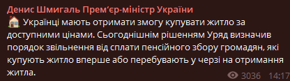 "Украинцы должны получить возможность покупать жилье по доступным ценам. Сегодняшним решением правительство определило порядок освобождения от уплаты пенсионного сбора граждан, которые приобретают жилье впервые или находятся в очереди на получение жилья", – отметил глава правительства.
