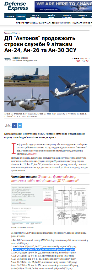 Специализированные авиационные СМИ в конце июля сообщали, что командование Военно-воздушных сил заключило контракт с заводом "Антонов" на продление срока службы девяти военным самолетам.