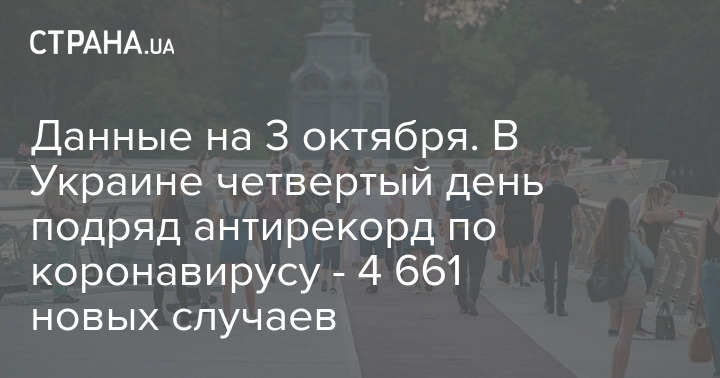 По состоянию на утро субботы, 3 октября, в Украине лабораторно подтверждены уже 222 322 случая коронавируса. 4 661 человек заразился Covid-19 в течение минувших суток, это на 28 человек больше, чем днем ранее. Таким образом, в Украине четвертый день подряд фиксируется антирекорд по новым случаям Covid-19