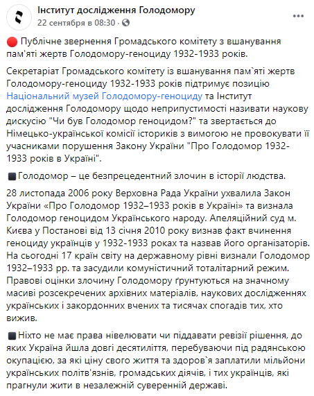 Очередной лакмусовой бумажкой такой странной позиции стал прямой отказ "комиссии" от участия в дискуссиях о признании Бундестагом Голодомора 1932-33 гг. Геноцидом украинского народа на основе соответствующей народной петиции, несмотря на соответствующие обращения к "комиссии" со стороны депутатов немецкого парламента", - заявили в посольстве.