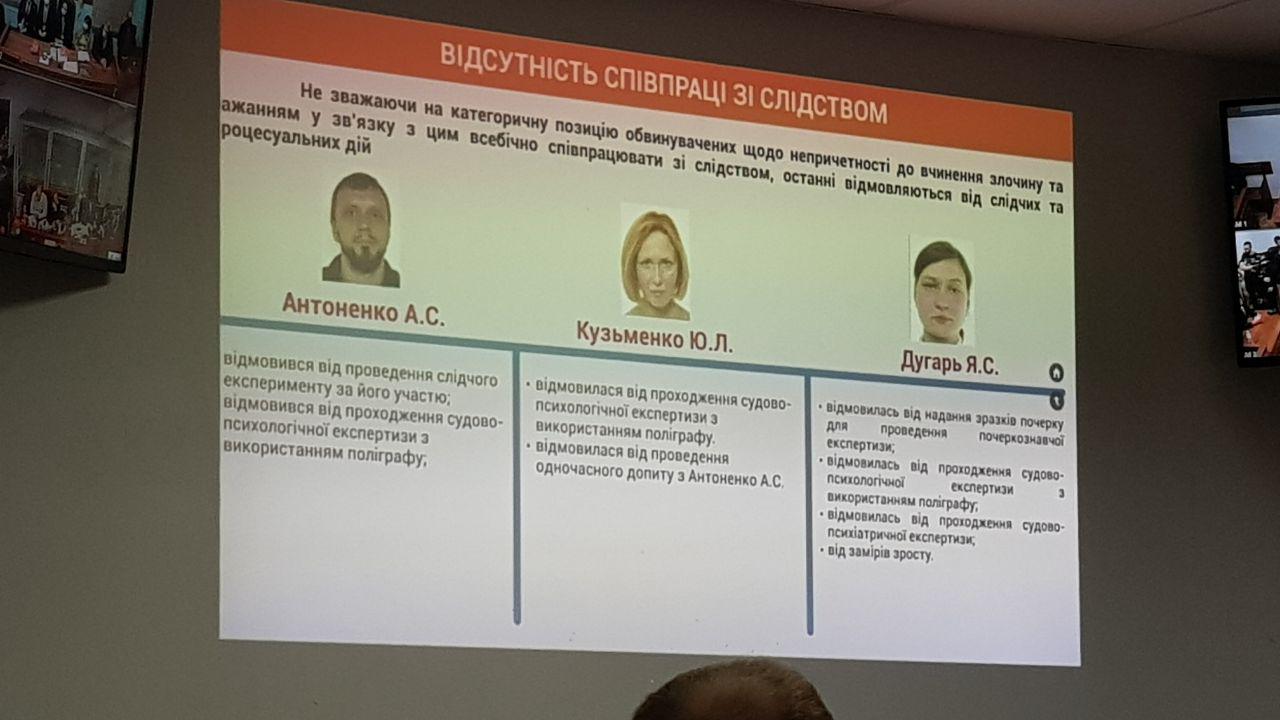 Антоненко отказался от проведения следственного эксперимента с его участием. Кузьменко отказалась от одновременного допроса с Антоненко, а Дугарь - от графологической экспертизы (предоставления образцов почерка), от судебно-психиатрической экспертизы и от замеров роста.