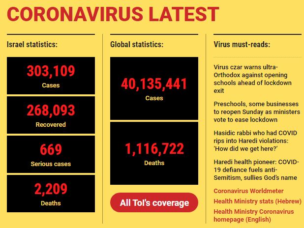 Всего в Израиле выявлены 302 832 случая коронавируса. Скончались 2190 человек, инфицированных COVID-19.