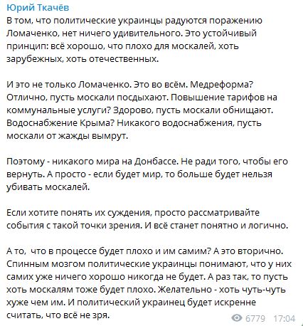 А то, что в процессе будет плохо и им самим? А это вторично. Спинным мозгом политические украинцы понимают, что у них самих уже ничего хорошо никогда не будет. А раз так, то пусть хоть москалям тоже будет плохо. Желательно - хоть чуть-чуть хуже чем им. И политический украинец будет искренне считать, что всё не зря" - написал журналист Юрий Ткачев.