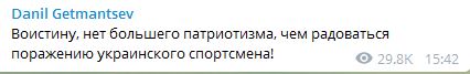 "Воистину, нет большего патриотизма, чем радоваться поражению украинского спортсмена!" - иронизирует нардеп Данил Гетьманцев.