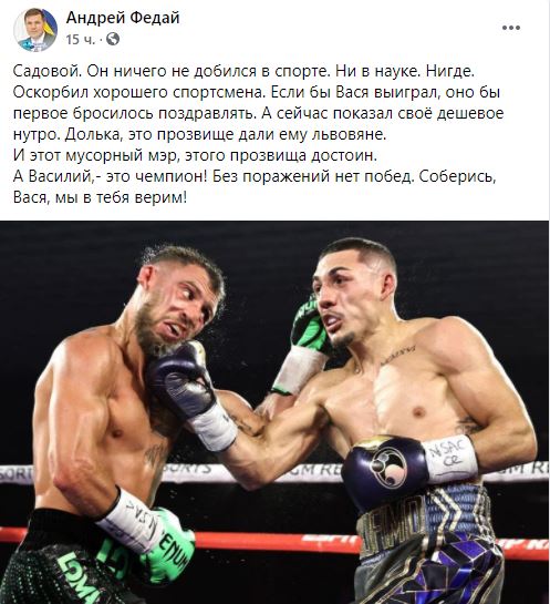"Садовой. Он ничего не добился в спорте. Ни в науке. Нигде. Оскорбил хорошего спортсмена. Если бы Вася выиграл, оно бы первое бросилось поздравлять. А сейчас показал своё дешевое нутро. Долька, это прозвище дали ему львовяне. И этот мусорный мэр, этого прозвища достоин. А Василий - это чемпион! Без поражений нет побед. Соберись, Вася, мы в тебя верим!" - написал депутат горсовета Мариуполя Андрей Федай.