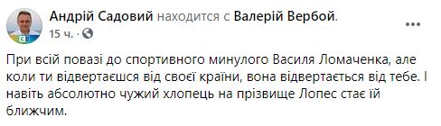 "При всем уважении к спортивному прошлому Василия Ломаченко, но когда ты отворачиваешься от своей страны, она отворачивается от тебя. И даже абсолютно чужой парень по фамилии Лопес становится ей ближе" - написал Андрей Садовой.