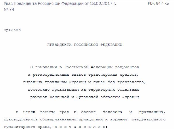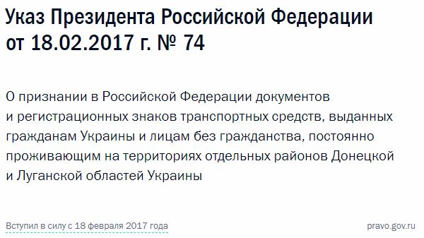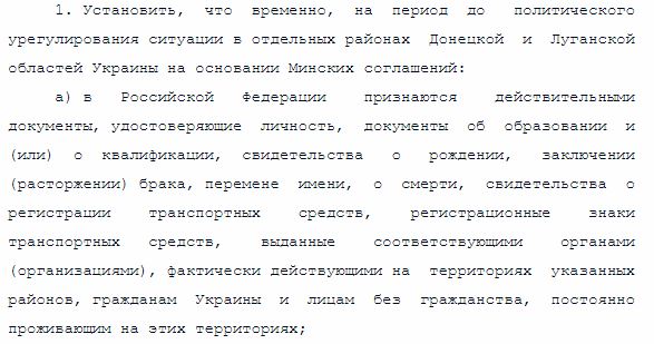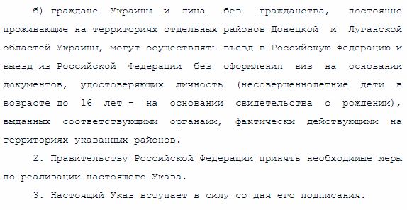 В указ №74 записано, что "временно, на период до политического урегулирования ситуации в отдельных районах Донецкой и Луганской областей Украины (...) б) граждане Украины и лица без гражданства, постоянно проживающие на отдельных территориях Донецкой и Луганской областей, могут осуществлять въезд и выезд из РФ без оформления виз на основании документов, удостоверяющих личность (несовершеннолетние дети в возрасте до 16 лет - на основании свидетельства о рождении), выданных соответствующими органами, фактически действующими на территориях указанных районов.