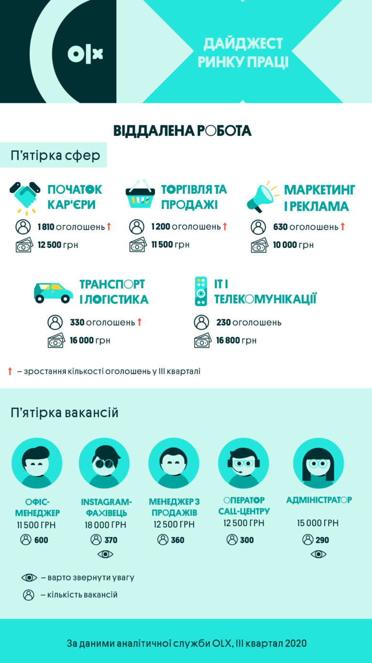 Второе место по количеству вакансий для дистанционной работы занимает сфера торговли и продаж (1,2 тыс вакансий в третьем квартале, что на 34% больше, чем во втором). Средняя зарплата - 11 500 грн.