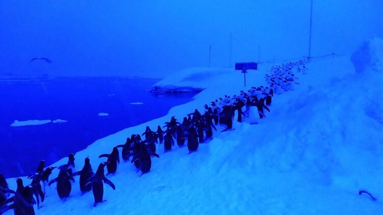 В Антарктиде в районе украинской станции Академик Вернадский пингвины выстраиваются в огромную очередь к океану, чтобы раздобыть рыбу.