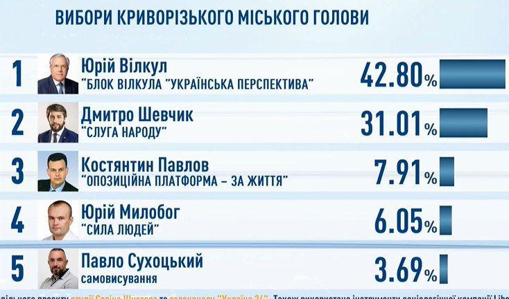 В родном городе президента во второй тур выходит действующий мэр Юрий Вилкул (42,80%) и кандидат от "Слуги народа" Дмитрий Шевчик (31,01%). Это единственный крупный город, где "слуга" вышел во второй тур.