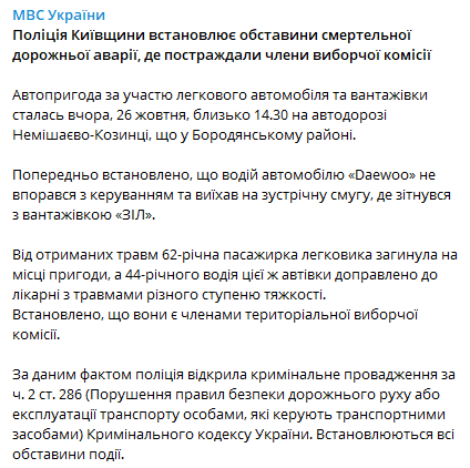 Под Киевом в Бородянском районе в смертельное ДТП попали члены избирательной комиссии. Инцидент произошел на автодороге Немешаево-Козинцы. Об этом сообщает пресс-служба Министерства внутренних дел Украины в своем Телеграм-канале.