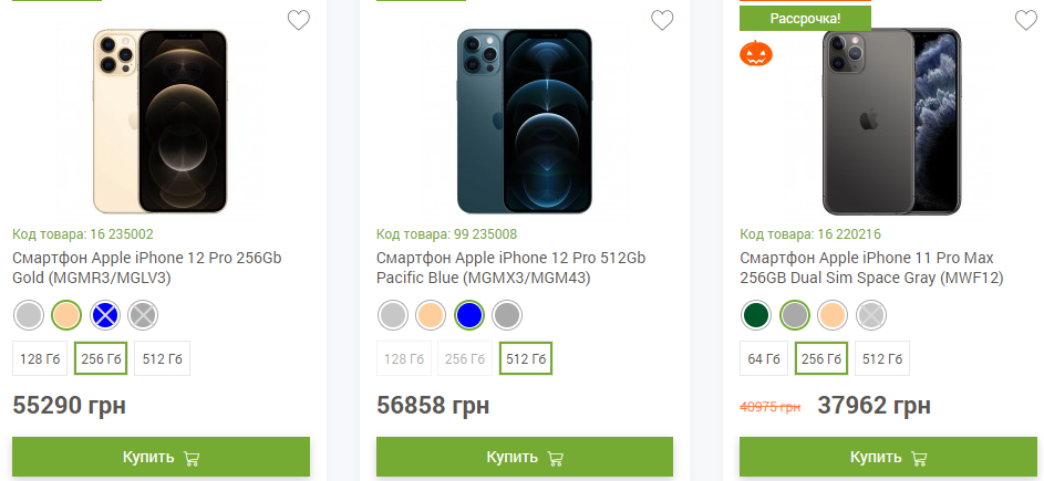 На olx.ua iPhone 12 Pro предлагают по цене от 34 450 грн до €1400 (46 966 грн) за 256 ГБ.