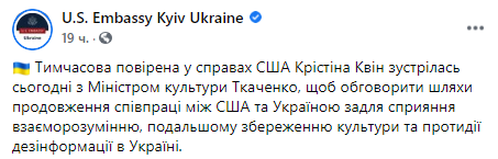 "Временный поверенный в делах США Кристина Квин встретилась сегодня с министром культуры Ткаченко, чтобы обсудить пути продолжения сотрудничества между США и Украиной для содействия взаимопониманию, дальнейшему сохранению культуры и противодействию дезинформации в Украине", - заявили в посольстве.