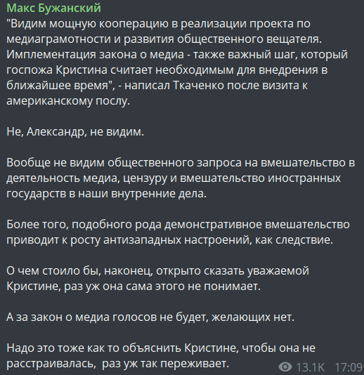 Позже стало понятно, что имелось в виду под словом "дезинформация". Как уточнил сам Ткаченко, посол поддержала принятие скандального закона о медиа, который облегчает блокировку сайтов и отзыв лицензий у телеканалов.
