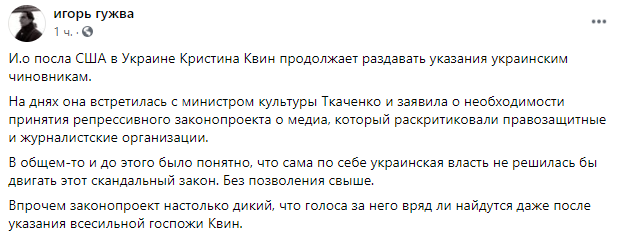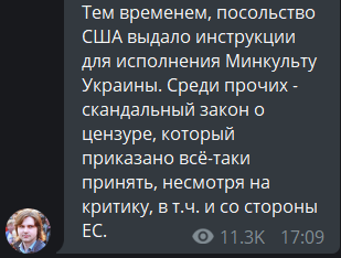 "Тем временем посольство США выдало инструкции для исполнения Минкульту Украины. Среди прочих - скандальный закон о цензуре, который приказано всё-таки принять, несмотря на критику, в т.ч. и со стороны ЕС", - пишет журналист Юрий Ткачев.