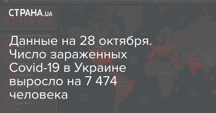 По состоянию на утро среды, 28 октября, в Украине подтвердилось еще 7 474 новых случая заражения коронавирусом. Общее число заболевших таким образом достигло отметки в 363 075 человек.