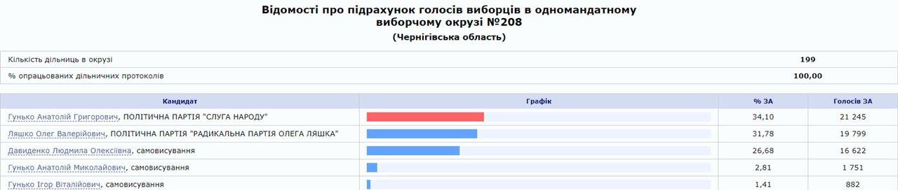 За "слугу народа" Анатолия Гунько отдали свои голоса 34,10% избирателей (это 21 245 голосов). Олег Ляшко занял второе место. Его поддержали 31,78% избирателей (19 799 голосов).