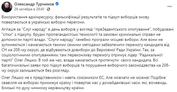 "Слуги народа" позорно проиграли местные выборы. Но они не останавливаются и пытаются такими же методами обеспечить победу кандидата от СН в 208-м округе, где происходят довыборы в Верховную Раду Украины", - написал он в Фейсбуке.