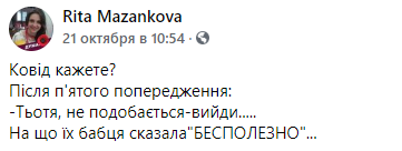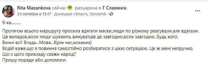 "На протяжении всего маршрута просила надевать маски, люди по-разному реагировали, но одевали. Это случай, когда люди ищут виновных где угодно, когда угодно. Кого угодно. Виноваты все! Власть ... Язык ... Кроме нас, любимых", - прокомментировала она инцидент в марштурке.