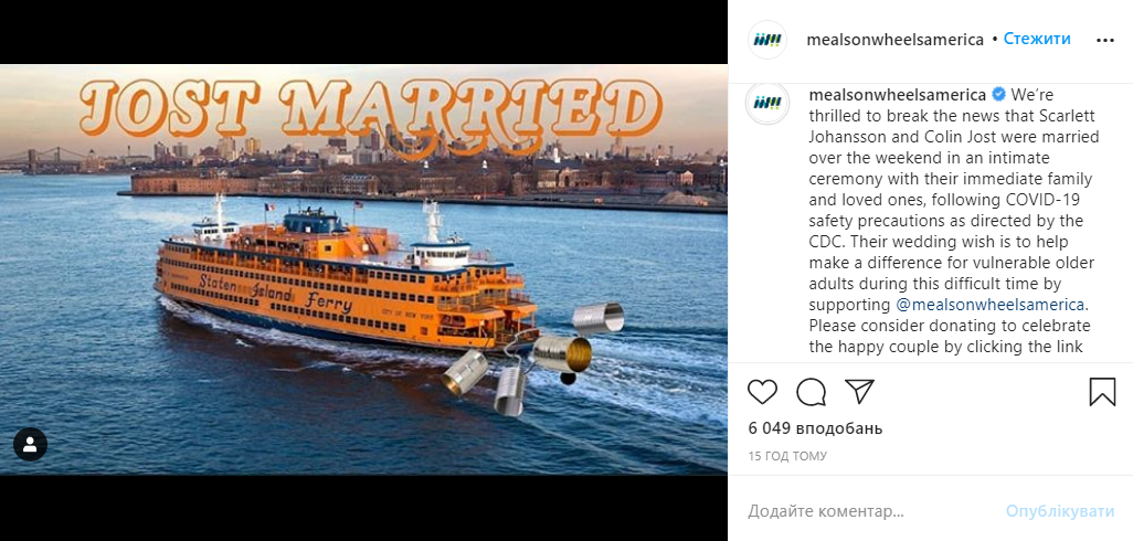 Потому в их посте, кроме поздравлений, содержалась просьба: "Их свадебное желание - помочь улучшить положение уязвимых пожилых людей в это трудное время, поддержав @mealsonwheelsamerica. Пожалуйста, подумайте о пожертвовании в честь счастливой пары, нажав на ссылку в нашей биографии".