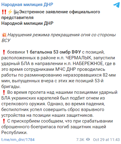 Еще утром четверга сепаратисты заявили, что из Чермалыка (40 км от Мариуполя, под контролем ВСУ) вылетел беспилотник, который "Народная милиция" подбила. Однако БПЛА успел сбросить взрывное устройство, и один из представителей воинских формирований погиб.