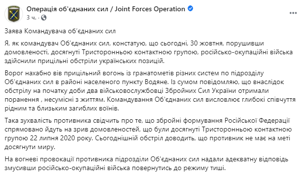 29 октября огнестрельное ранение получил боец на позициях у Водяного под Мариуполем. В тот же день у Золотого-4 беспилотник сбросил гранату на позиции ВСУ - один из бойцов получил осколочное ранение. Оба доставлены в больницу.