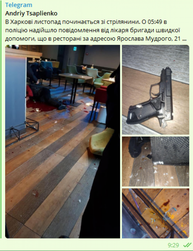 По его данным, около 05:49 в заведении по адресу Ярослава Мудрого, 21, мужчина в возрасте около 40 лет зашел в ресторан и по неизвестной причине открыл стрельбу. Находящиеся в ресторане начали разбивать об него бутылки. В результате он скончался.