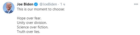 23:30 Байден убеждает избирателей тем, что голосуя за него американцы выбирают надежду, единство, науку и правду.