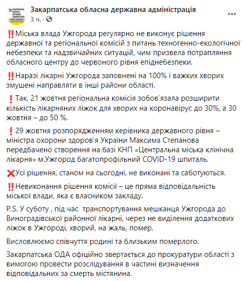 В сообщении говорится, что в октябре региональная комиссия обязала Ужгород расширить количество коек для больных коронавирусом до 50%, а в конце месяца министр здравоохранения Максим Степанов распорядился создать ковид-госпиталь на базе Центральной городской клинической больницы. Однако по состоянию на сегодня эти предписания не выполняются.