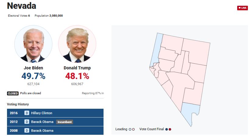В Неваде (6 выборщиков), которая считается исконно за демократами, продолжает лидировать Байден - 49,3% против 48,7% у Трампа. Обработано 75% голосов.